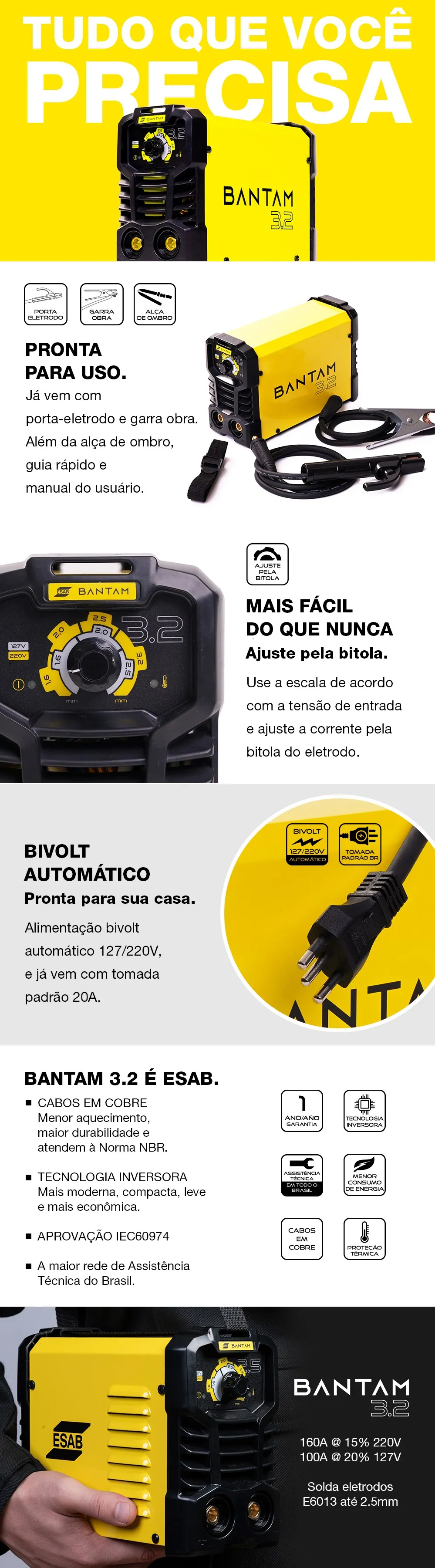 A Máquina de Solda Inversora ESAB Bantam 3.2 traz um novo conceito de máquinas portáteis, com alta tecnologia dos inversores ESAB, ideal para serralheiros e usuários finais que necessitam realizar projetos dentro e fora da oficina. Seguindo a tradição da marca, Bantam é sinônimo de um equipamento seguro, robusto e confiável, capaz de acompanhar o soldador onde o trabalho estiver.